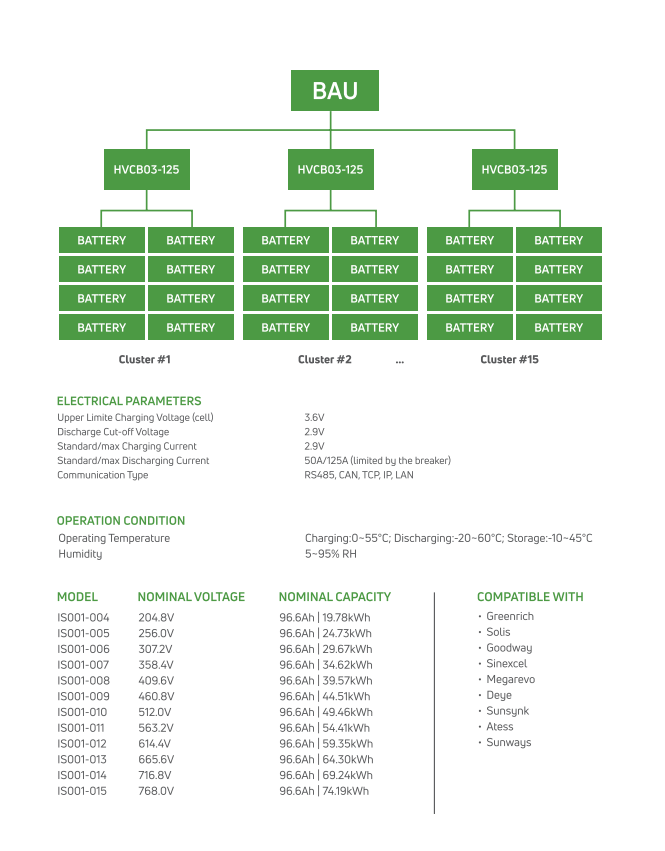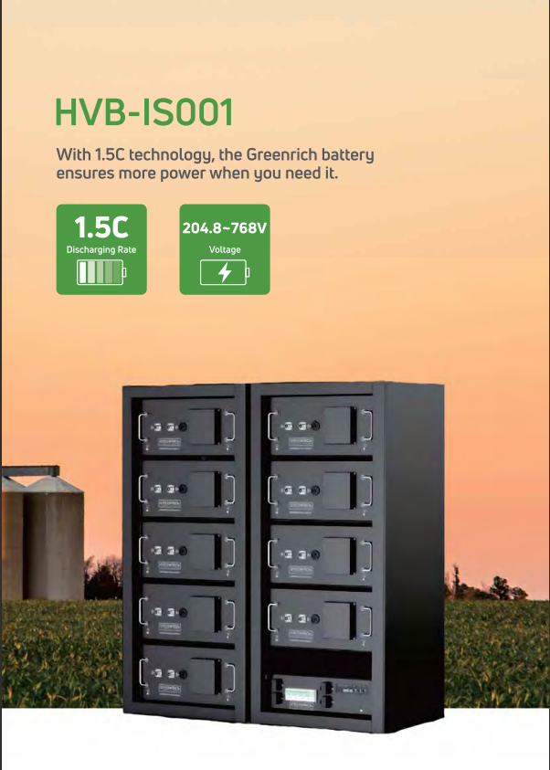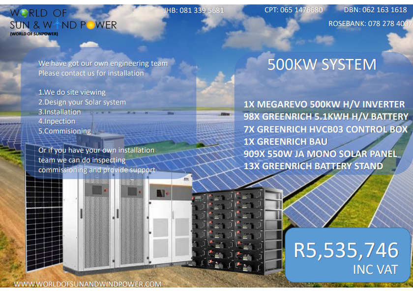 1X MEGAREVO 500KW H/V INVERTER 196X GREENRICH 5.1KWH H/V BATTERY7X GREENRICH HVCB03 CONTROL BOX1X GREENRICH BAU 909X 550W JA MONO SOLAR PANEL 25X GREENRICH BATTERY STAND