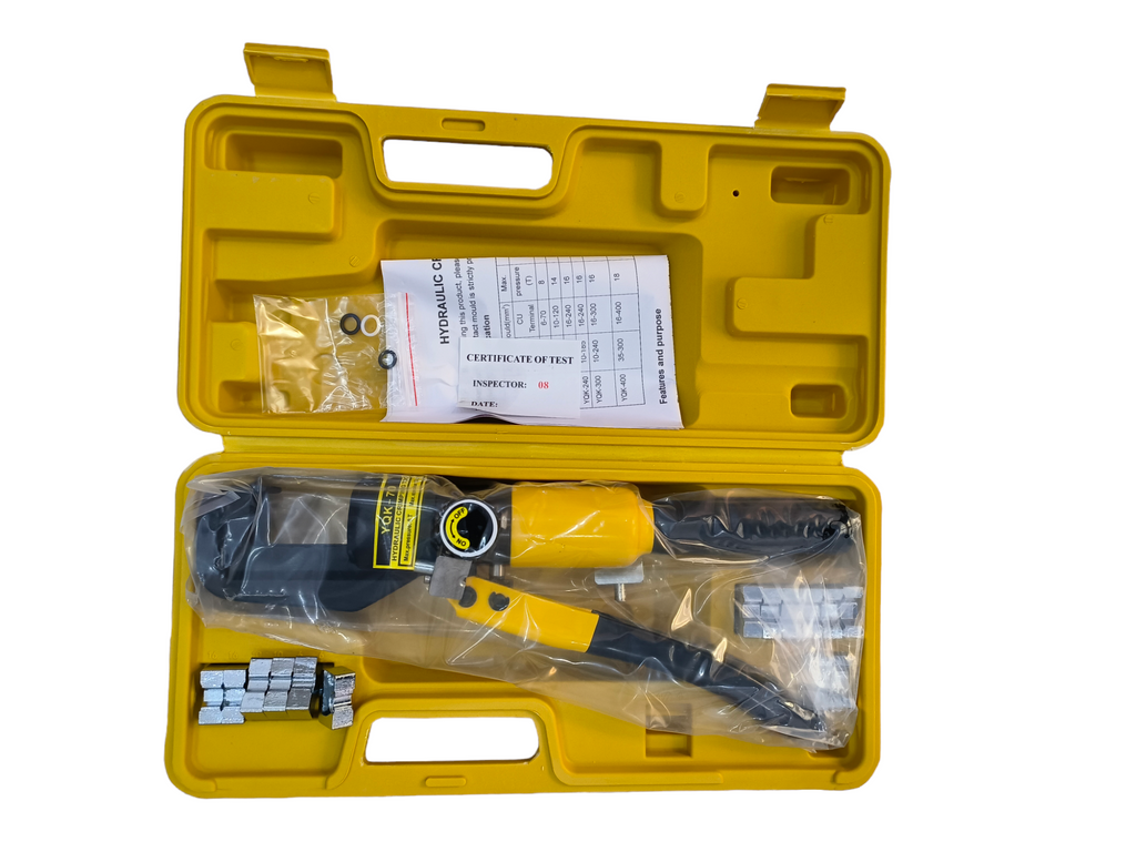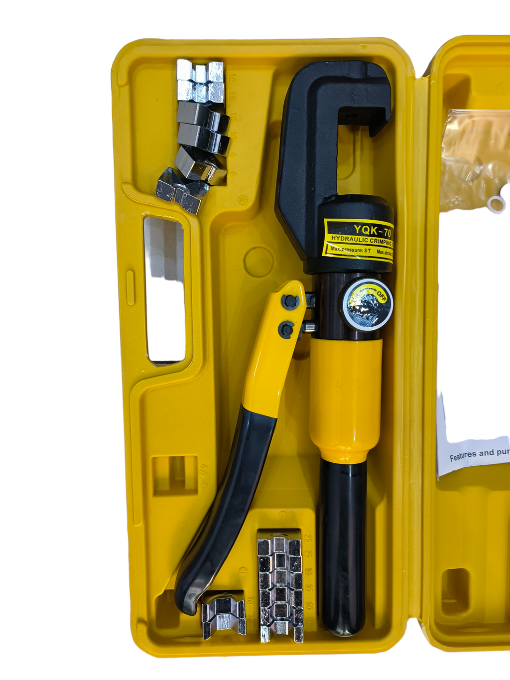 SPECIFICATION: Crimps 12 AWG to 2/0 AWG size copper and aluminum wires. Crimping range is from 6 to 70 mm2. Maximum crimping power: 8 tons.